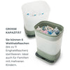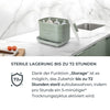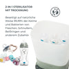 Der SteriDry Sterilisator verwendet Hochtemperaturdampf, um 99,99% der Keime und Bakterien auf natürliche Weise zu eliminieren. Nach der Sterilisation trocknet er das Zubehör mit gereinigter Luft durch ein HEPA-Filter, wodurch eine sichere Hygiene für das Baby gewährleistet wird.