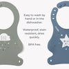 Yes, the silicone bib is easy to wash by hand or can be washed in the dishwasher for quick and convenient cleaning.