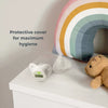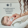 El termómetro digital para chupete de Nuvita se introduce en la boca del bebé como si fuera un chupete. El sensor del interior de la tetina detecta la temperatura oral real y el valor aparece en la pantalla del termómetro.