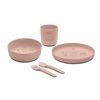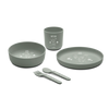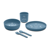 Set de papilla completo en bioplástico compuesto por platillo y bol con bordes altos antisalpicaduras, vaso y cubiertos de cómodo agarre para las manos de los niños y que facilitan el aprendizaje y la adquisición de autonomía durante las comidas.