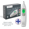 L'écran rétroéclairé du thermomètre auriculaire numérique change de couleur en fonction de la valeur détectée et émet un signal acoustique en cas de fièvre supérieure à 38°C.
